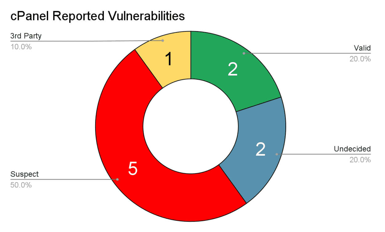 • 2 vulnerabilities were confirmed as being valid and the cPanel team is fixing them (we’ll release further details once these vulnerabilities are resolved)
