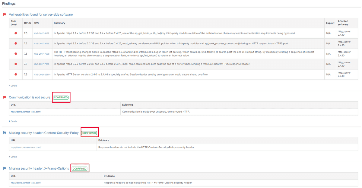 Each finding is marked as Confirmed so you can easily select the interesting ones to include in the final pentest report.